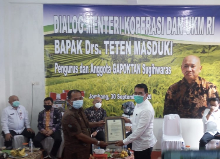 JOMBANGKAB, Dinkopum (30/09/2020) - Menteri Koperasi dan UKM Republik Indonesia, Teten Masduki menyebutkan bahwa koperasi merupakan kelembagaan ekonomi rakyat yang paling tepat dalam mewujudkan demokrasi ekonomi. Selain itu nilai dan prinsip koperasi juga sejalan dengan Pancasila. “Pada praktiknya di Indonesia, koperasi pangan mampu menyediakan lapangan pekerjaan yang luas,” katanya.
