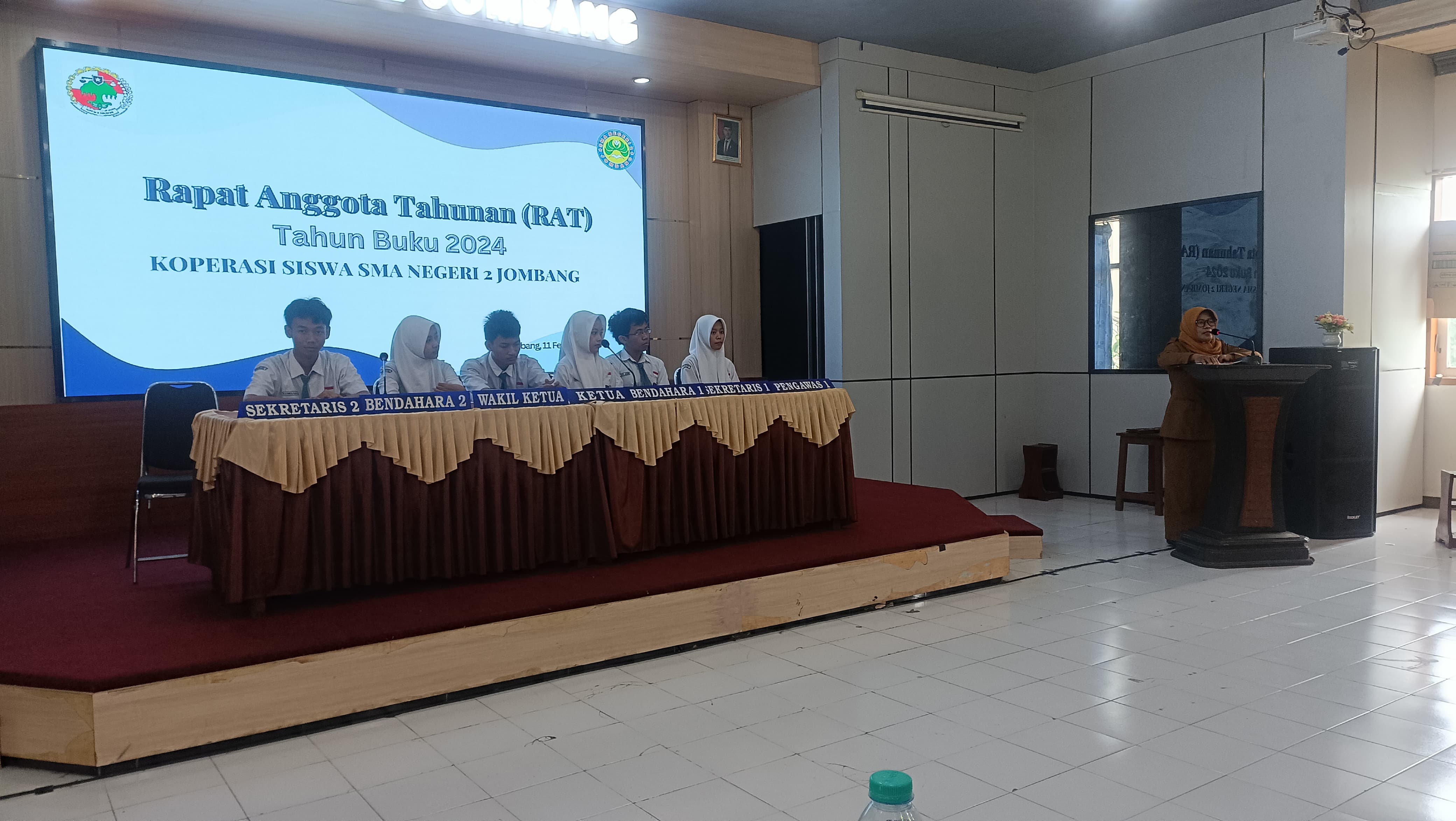 JOMBANGKAB_DINKOPUM - SMA Negeri 2 Jombang sukses menggelar Rapat Anggota Tahunan (RAT) Koperasi Siswa (KOPSIS) Tahun Buku 2024 pada Selasa (11/02/2025). Acara yang berlangsung di Aula Ki Hajar Dewantara ini dihadiri oleh Kepala SMA Negeri 2 Jombang, Kepala Cabang Dinas Pendidikan Provinsi Wilayah Kabupaten Jombang, Perwakilan Dinas Koperasi dan Usaha Mikro Kabupaten Jombang, Ketua OSIS, serta seluruh anggota koperasi sekolah.