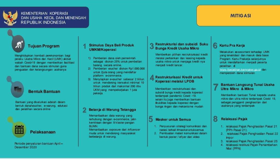 Program Mitigasi dari Kemenkop RI diselenggarakan agar para pelaku usaha mikro dan sektor koperasi mampu memulihkan kondisi roda perekonomian dengan cepat melalui teknologi, yakni dengan metode e-commerce.